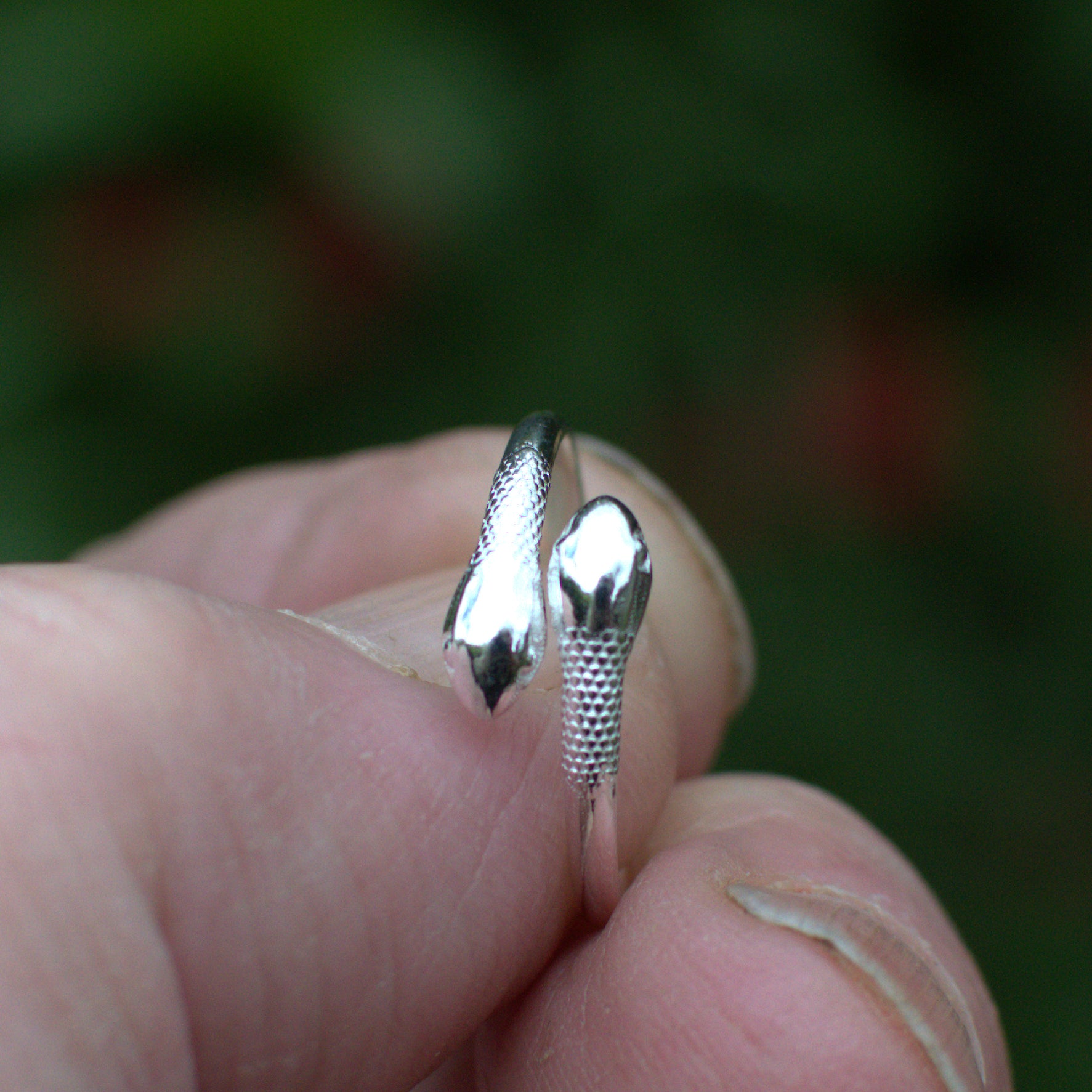 Solid 925 silver snake ring featuring an adjustable design with a size of 18.5mm outer diameter. Perfect for any finger, this double head snake ring evokes the power and mystery of nature.