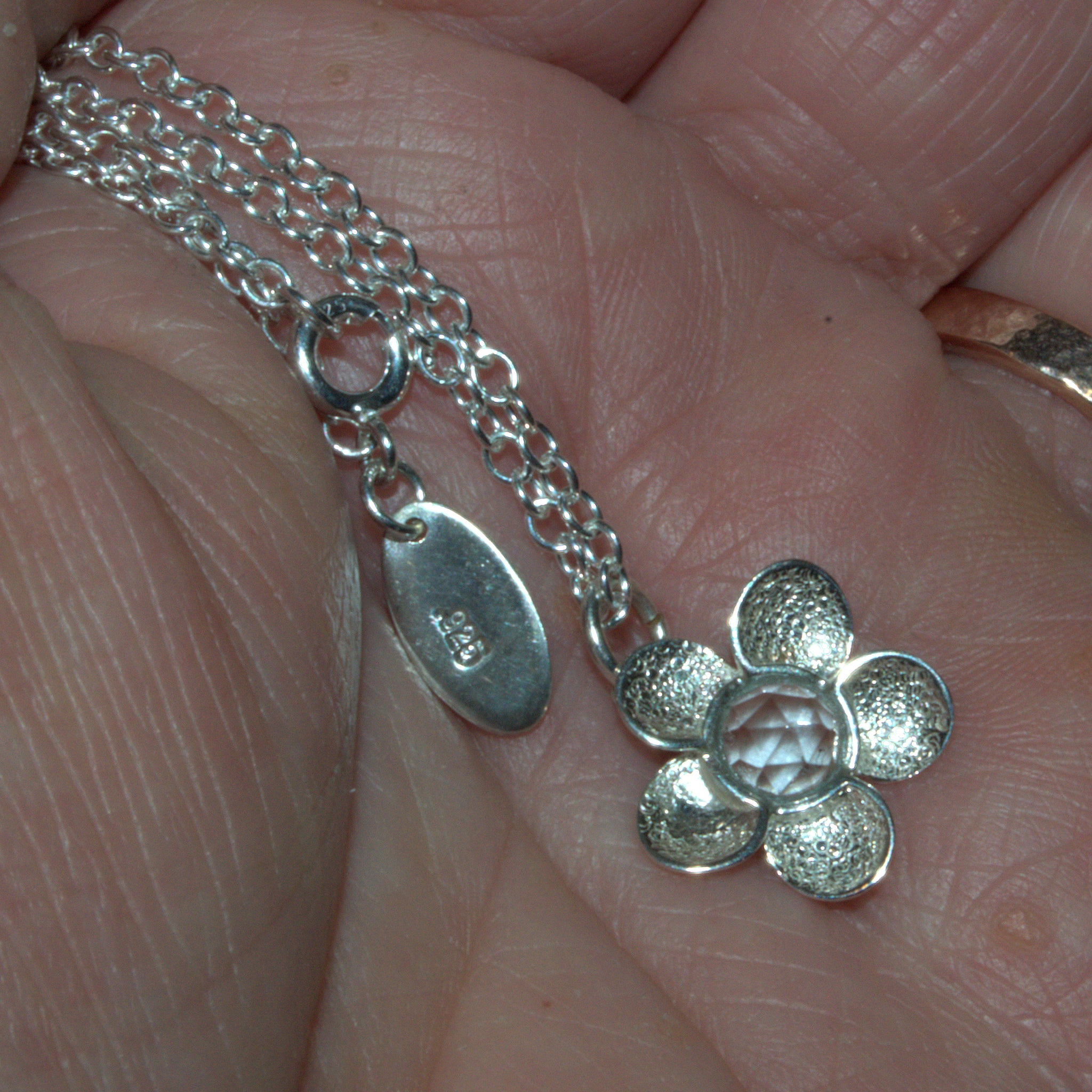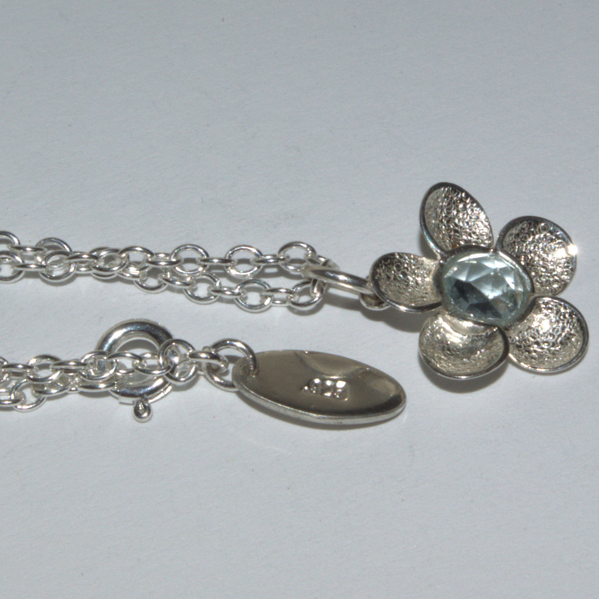 This enchanting pendant features a rose cut Aquamarine gemstone cradled within a delicate 925 solid silver flower setting. Its open back design invites light to dance through the stone, enhancing its ethereal glow. Suspended from a sleek silver trace chain, this piece captures the serene beauty of nature.
