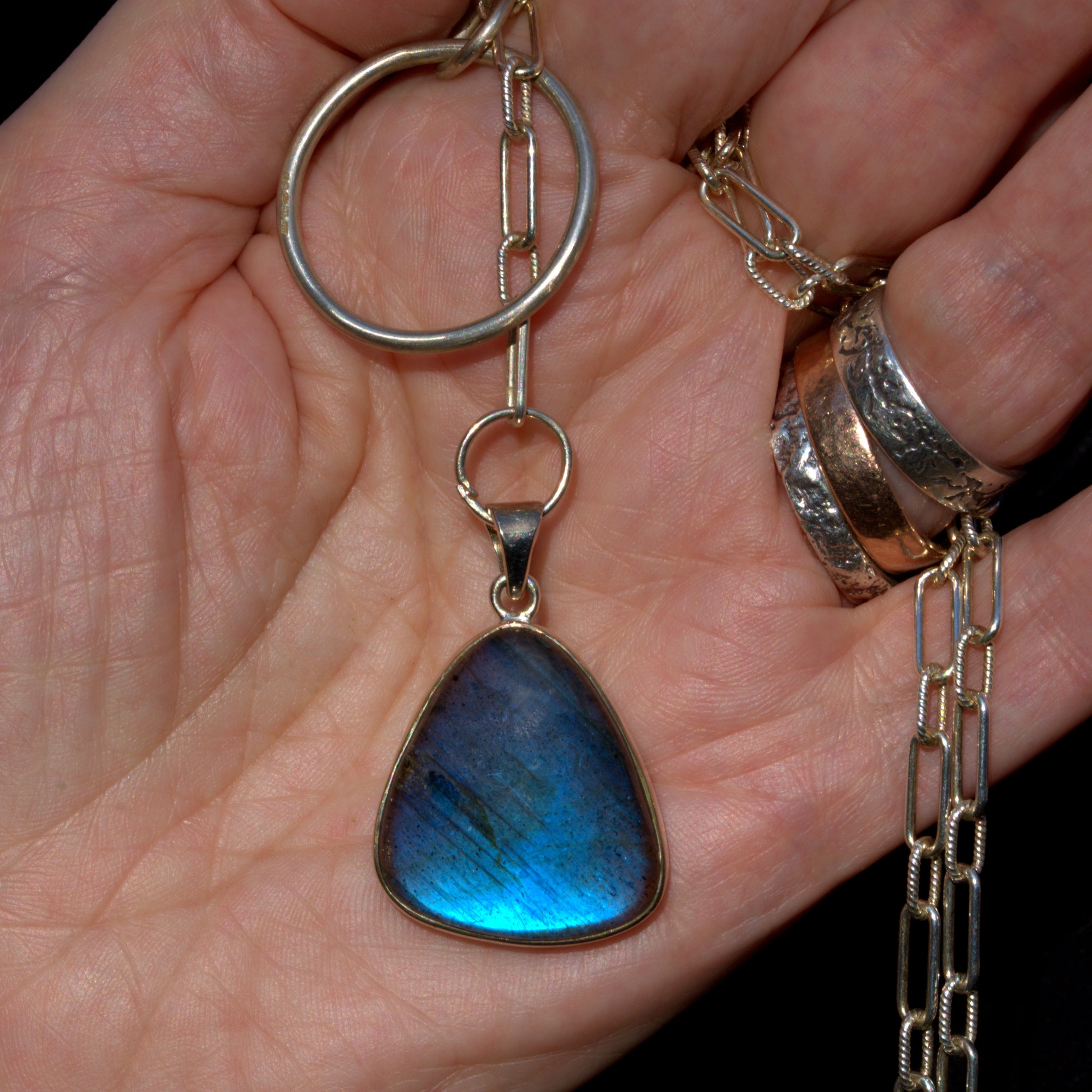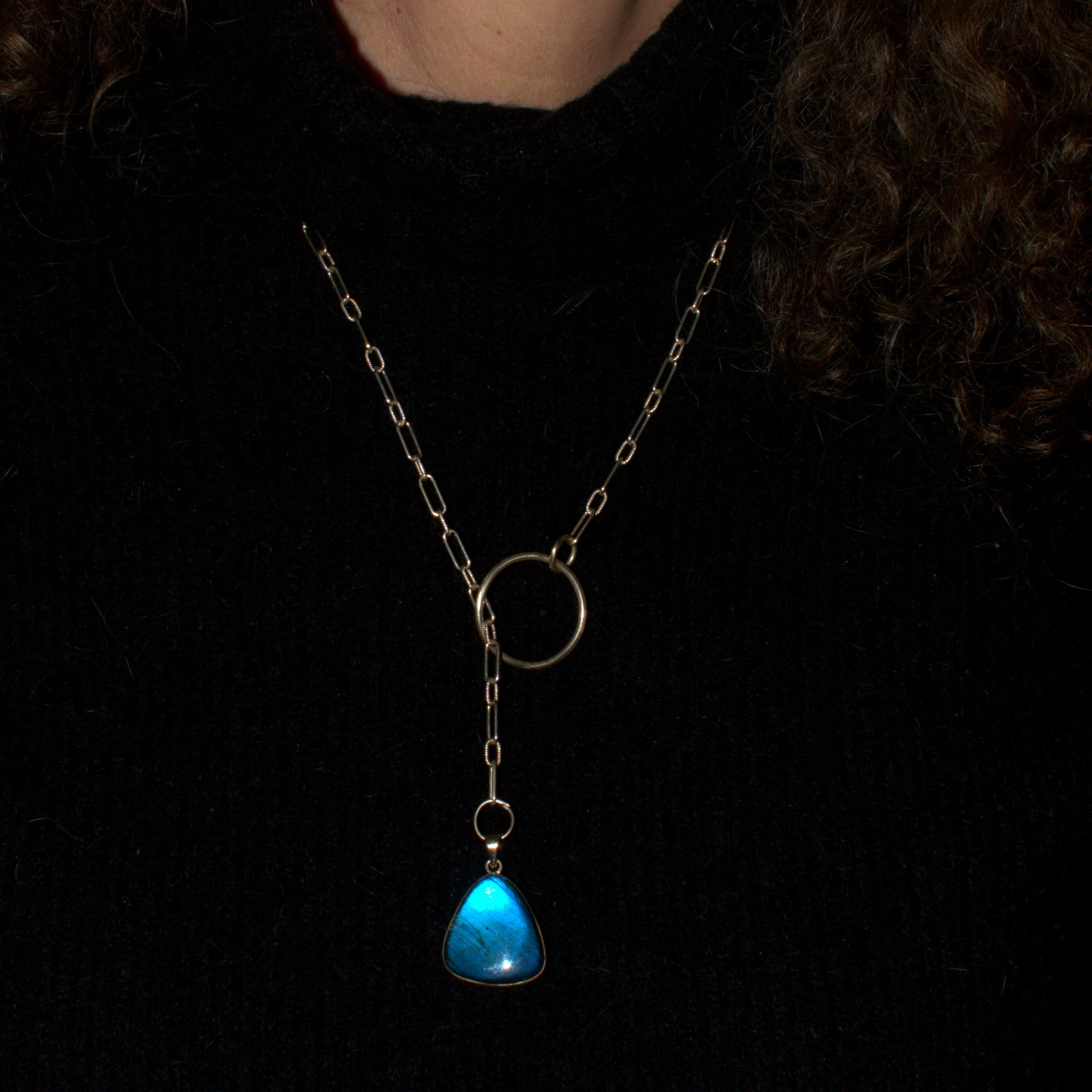 Crafted from 925 solid silver, this lariat necklace features a triangular shaped blue Labradorite gemstone set in an open back bezel, allowing light to dance through the stone's natural iridescence. Connected to a solid silver oblong cable chain and large circular link, this adjustable Y design necklace offers versatile styling for any occasion.