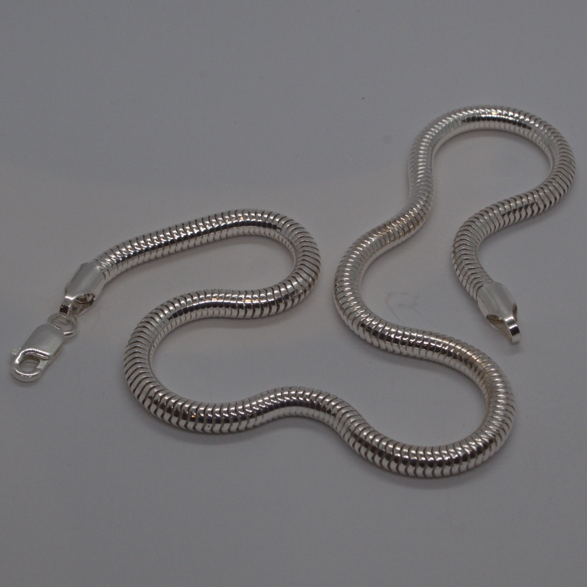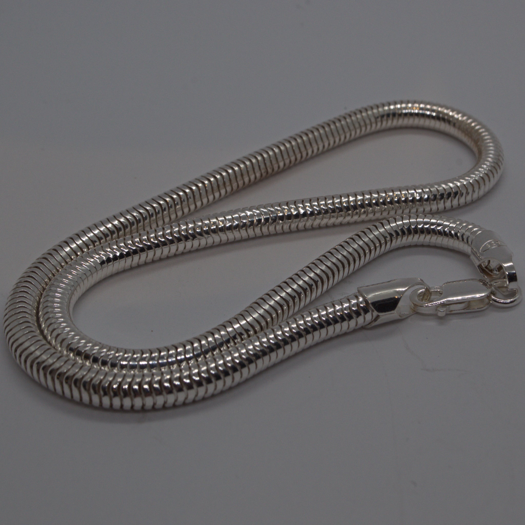 Solid 925 sterling silver 5mm wide round snake chain fastened with a lobster catch.