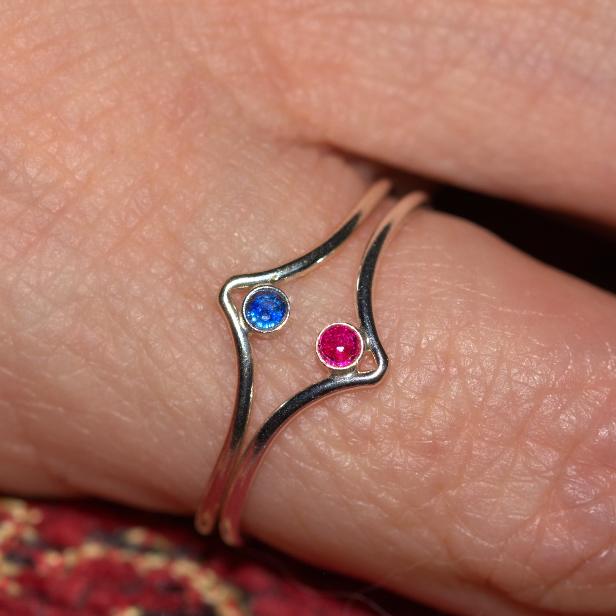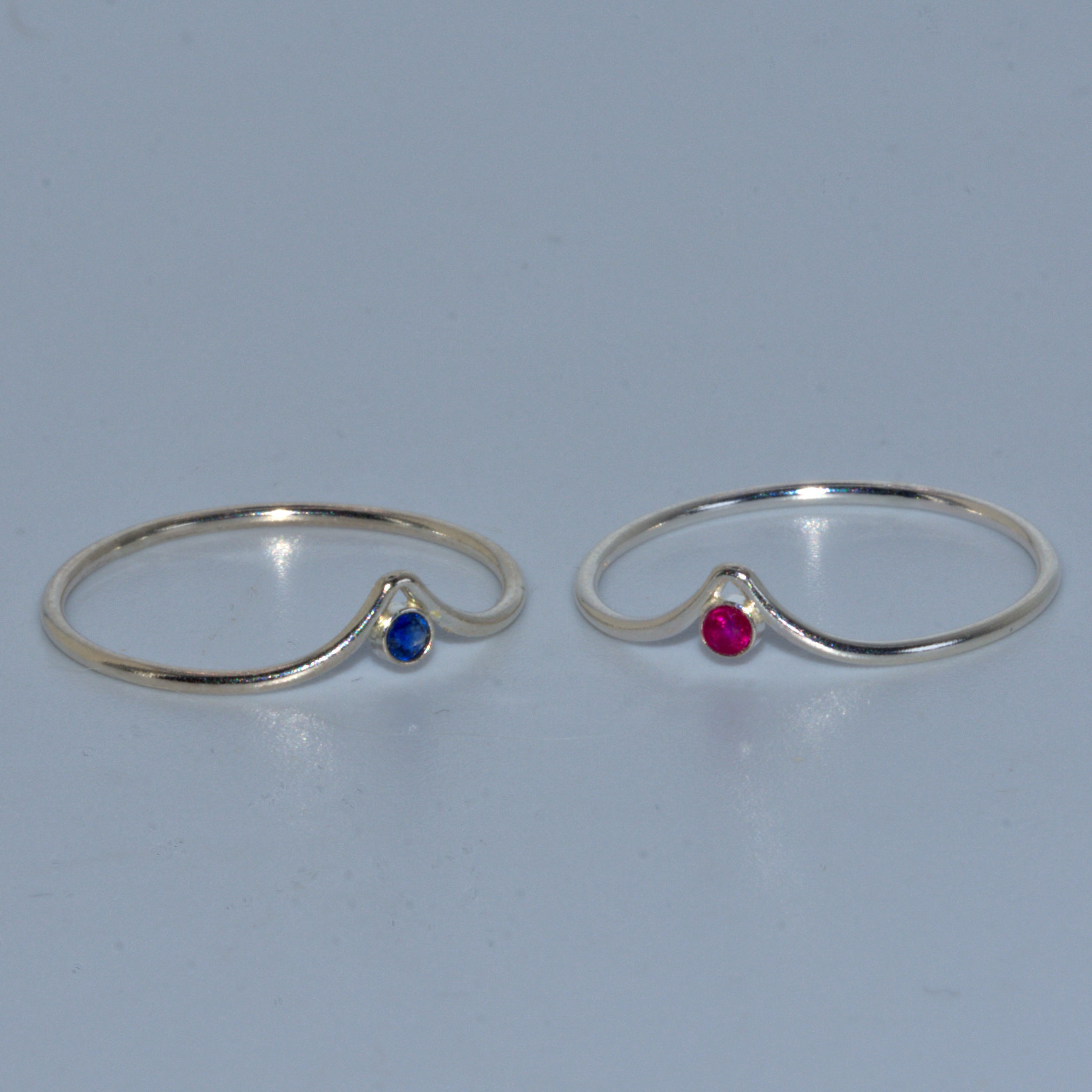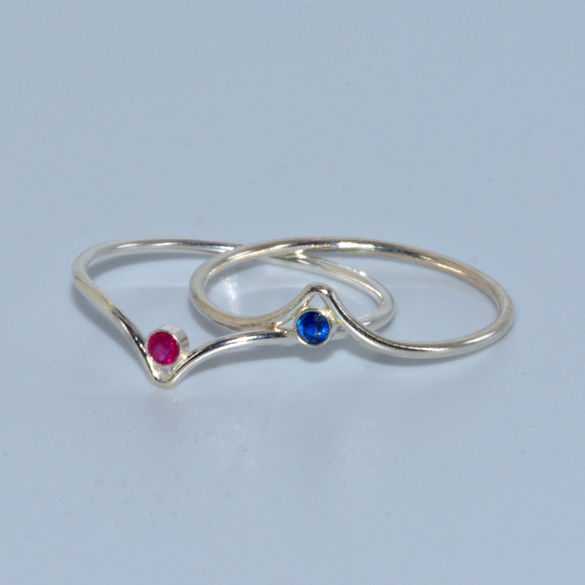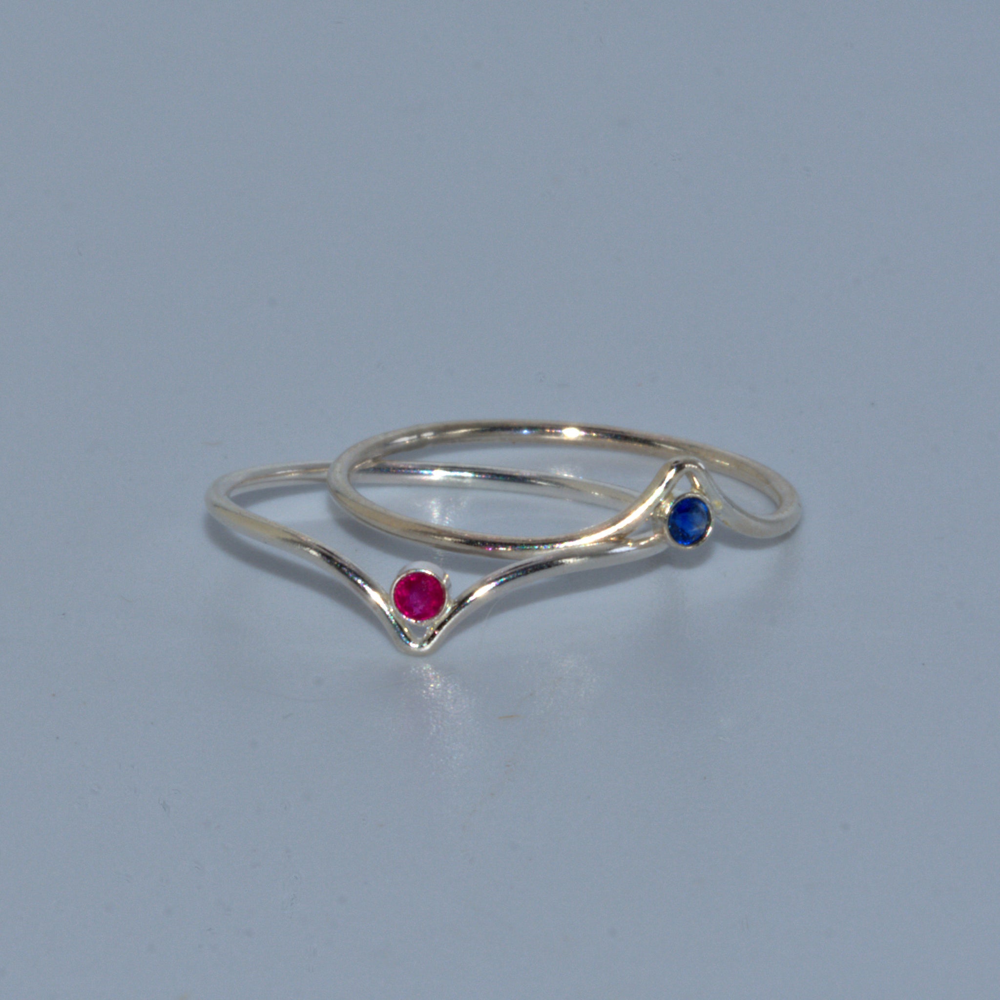 A set of two solid silver Ruby and Sapphire stacking rings which can be worn together or separately. Each ring is designed to feature a 2mm faceted round gemstone, with one showcasing a vibrant pink Ruby and the other a deep blue Sapphire.