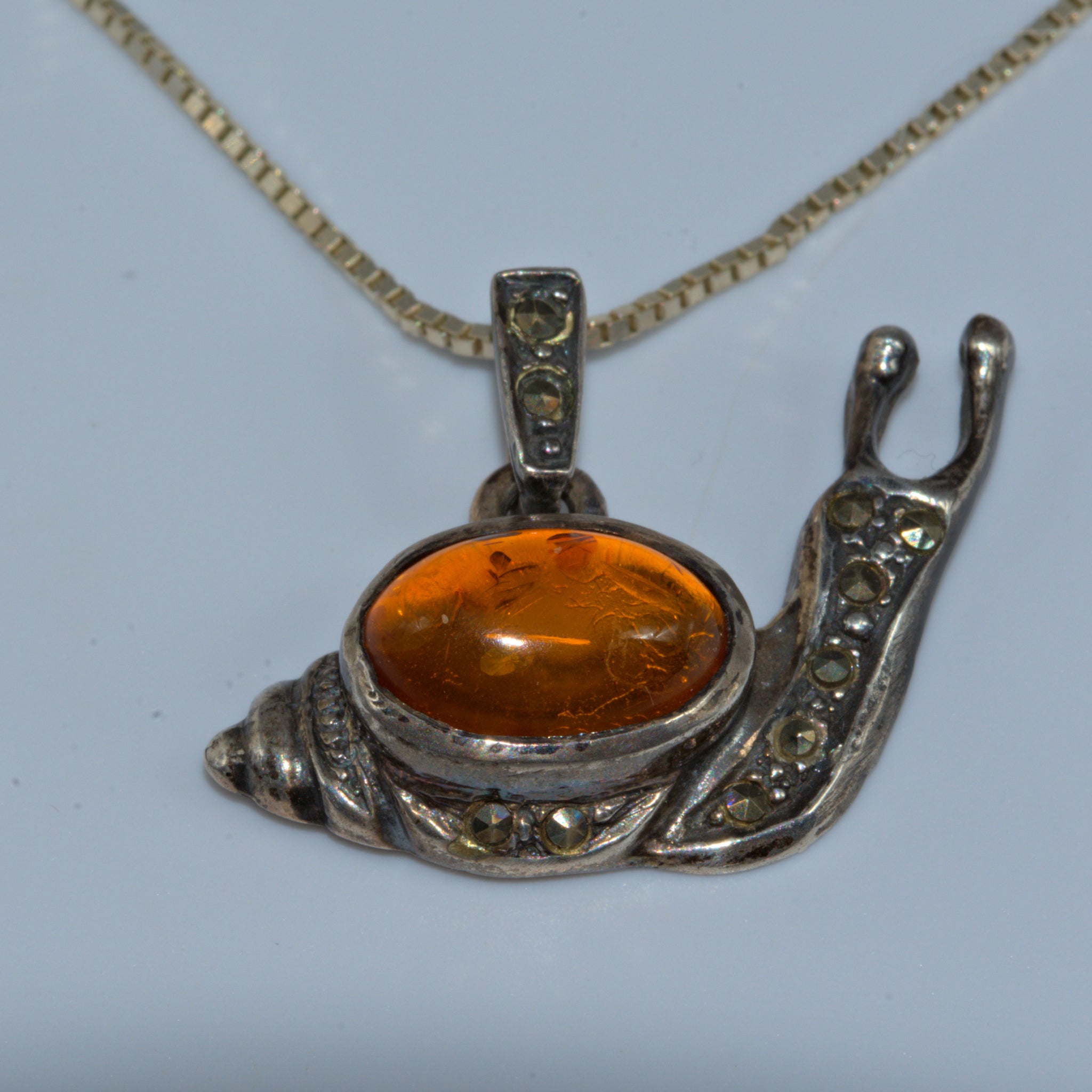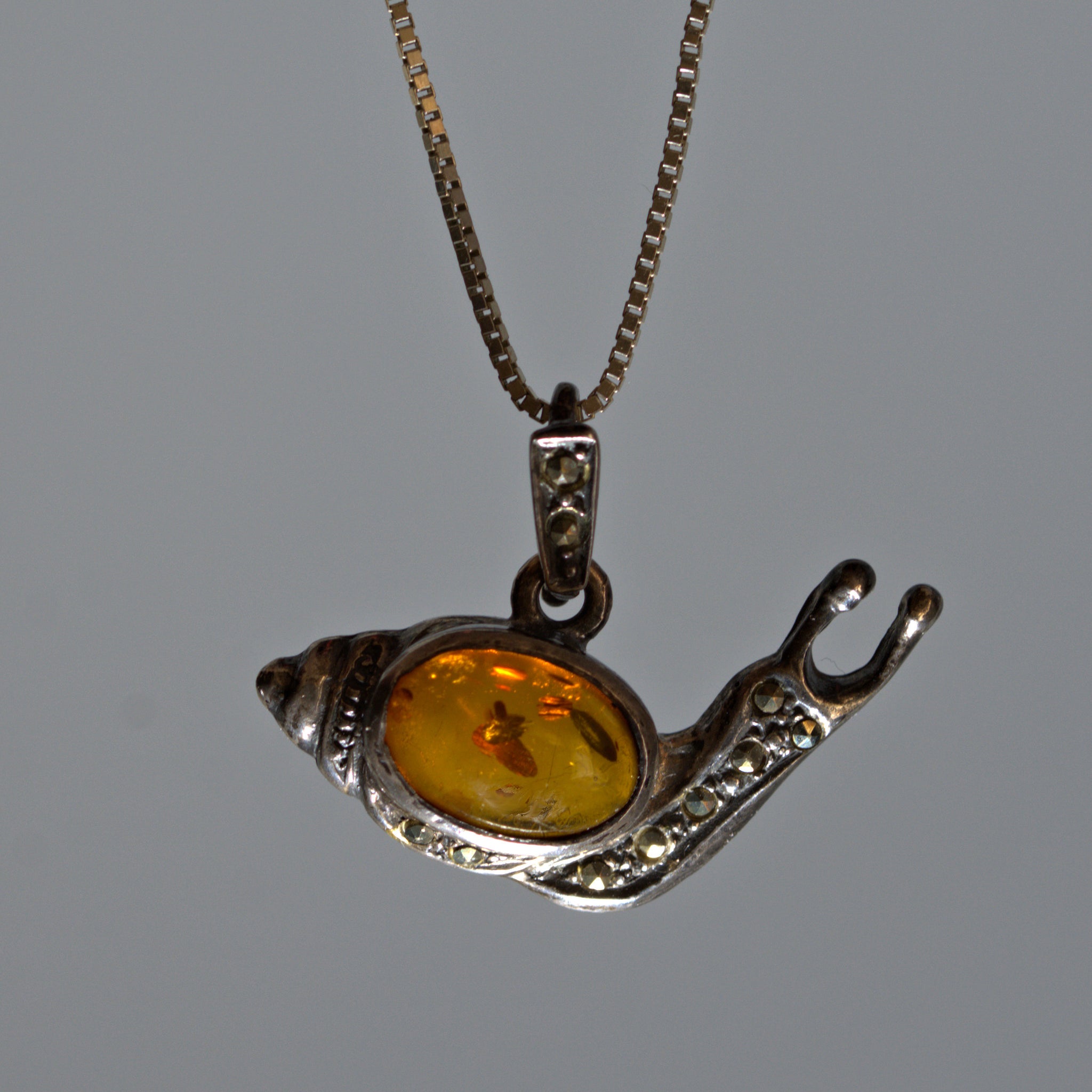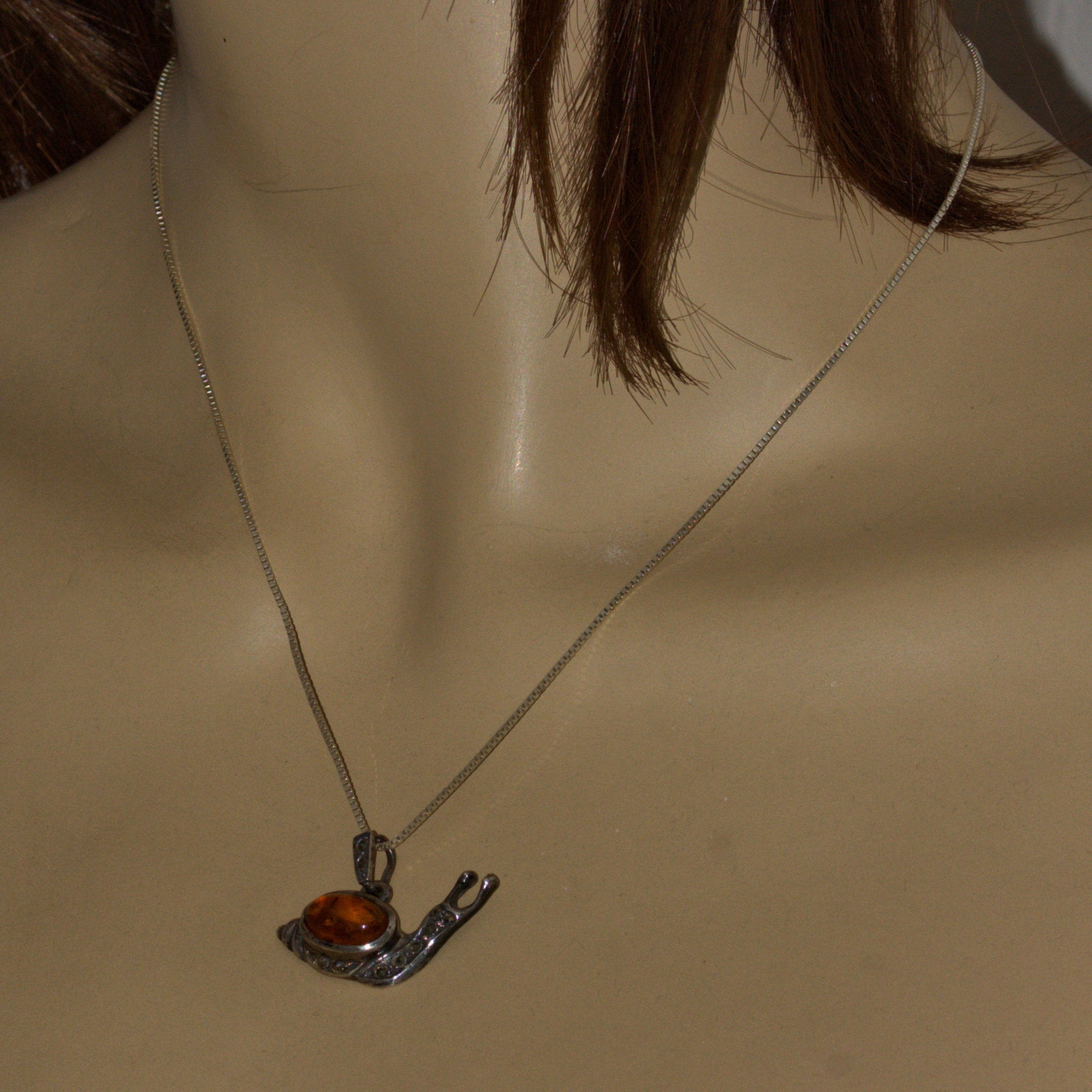 This enchanting solid silver woodland snail pendant captures the mystical spirit of nature with a luminous Baltic Amber stone at its heart. Ten glittering marcasite stones adorn the length of the body and bail. Paired with a 925 silver box chain, this pendant charm connects nature lovers to the earth’s quiet wonders.